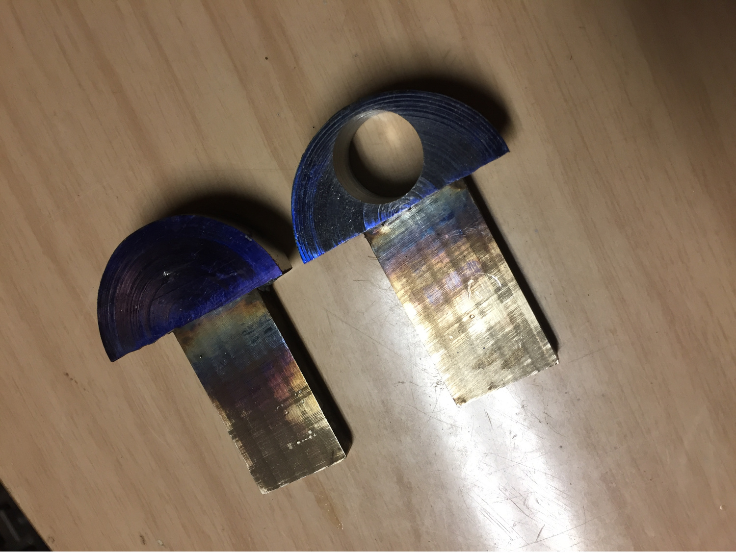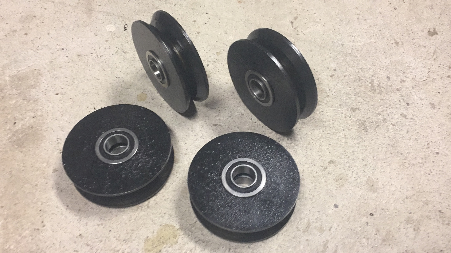 The finished hub adapter and drive pully sitting on the wheel hub.Notice one of the drain holes to keep water from collecting in the bore for the mounting bolts.